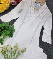 জামা :  লিলেন কাপড়ের উপর পিনটক ডিজাইন  করা ।জামার লং:-৪৪/৪৫ ইঞ্চি। গলায়,হাতায় এবং দামানে  লেসের কাজ করা । বডি সাইজ ৪২ ইঞ্চি।